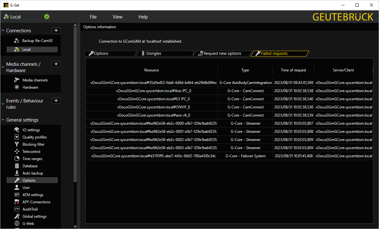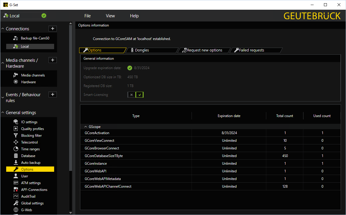 This tab provides an overview of the available licenses. It contains information about the options in the database and displays all available options. Right-click on an entry to expand the list with more information.