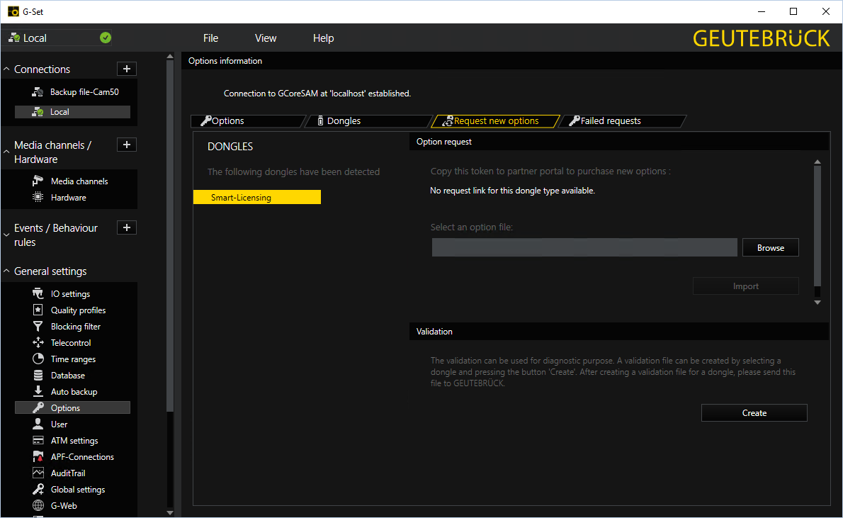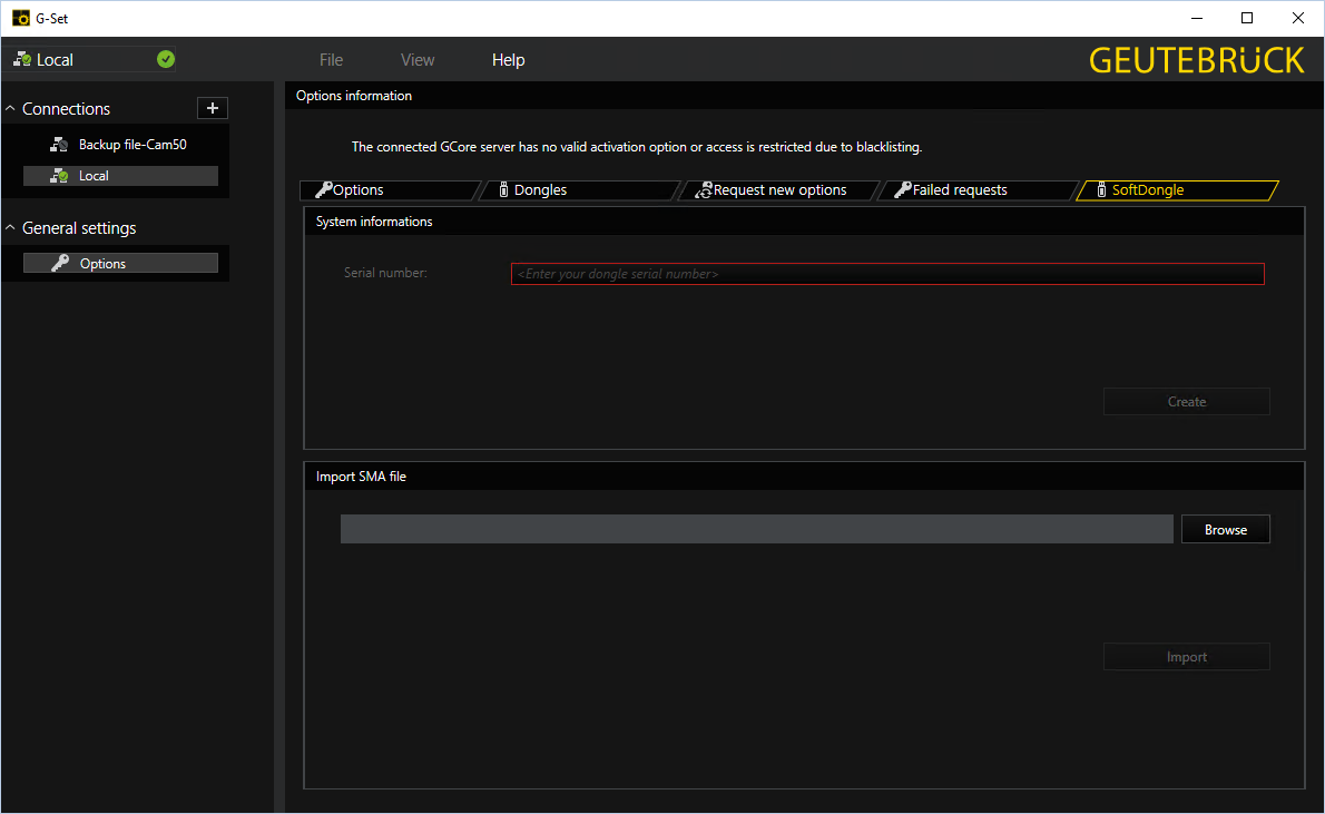 In this tab you can request and import a softdongle. For information on how to activate a softdongle, see Activate Softdongle.