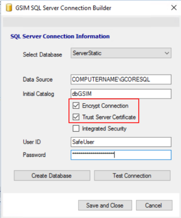 Then the GSIM SQL Server Connection Builder must be used to change the user used and his credentials. This must also be done for each database: