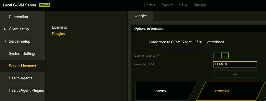 If you use the Remote-Dongle-Mode of the G-Core SAM, you have to configure the connection to the central SAM service in this tab.