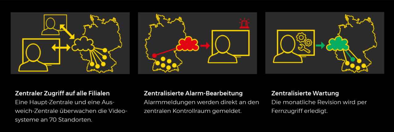 Der Kunde wünscht eine deutliche Verschärfung der Video-Sicherheitsmaßnahmen und einen zentralen Überblick über alle 70 Standorte.