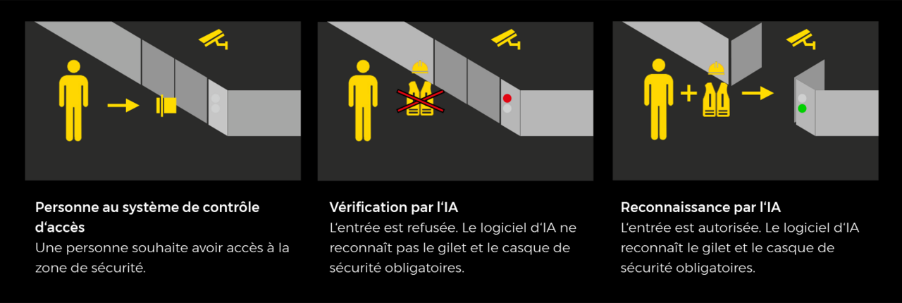 Si l‘IA identifie l‘équipement de protection obligatoire, la porte de la zone de sécurité est automatiquement déverrouillée. Si l‘IA n‘identifie qu‘une partie de l‘équipement de protection, l‘accès reste bloqué