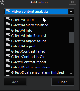 Um Ereignisse auszulösen, muss eine Aktion aus der Aktionsliste ausgewählt und über die Schaltfläche Hinzufügen zur Ereignisliste hinzugefügt werden:
