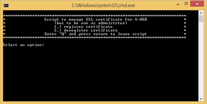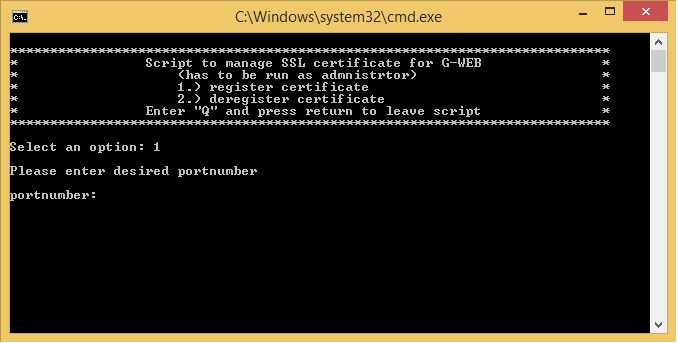 Open the file GCoreWeb_RegisterSSLCerificate.bat as an administrator. To register a certificate, press 1.
