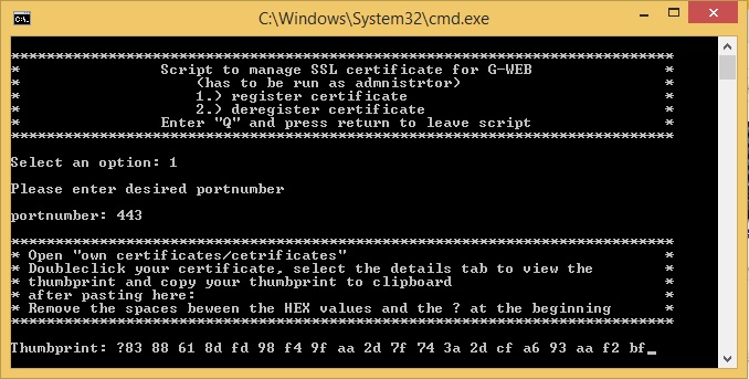 The program now asks for the thumbprint of the certificate. To obtain it, GCoreWeb_RegisterSSLCerificate.bat automatically opens the Windows Certificate Manager.
