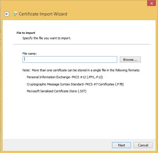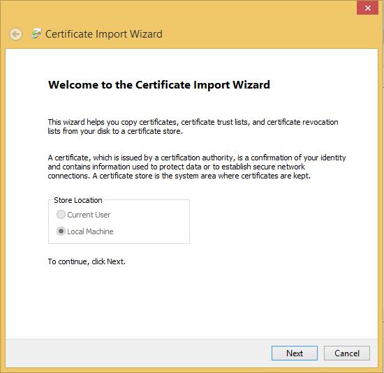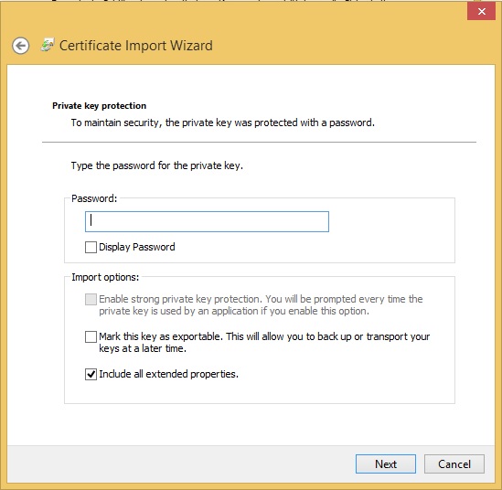 Optionally: The option Enable strong private key protection… when the private key should not be made available to everyone when re-using the certificate.