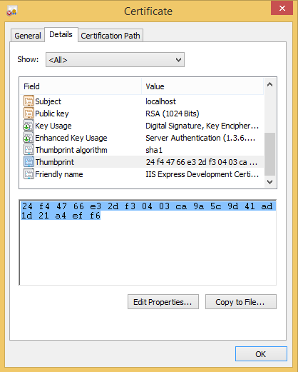 In the tab Details click on the entry Thumbprint and copy the HEX number series from the lower window.