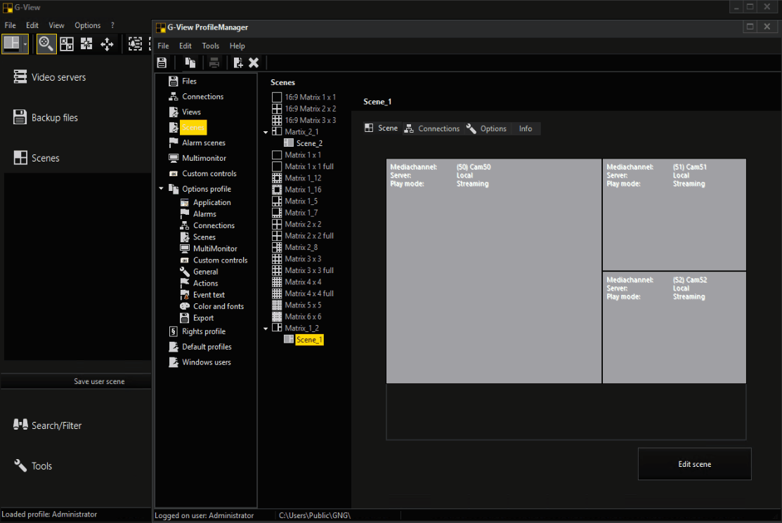 In the Scenes menu a number of settings for each viewer can be configured (media channel assignment, playback mode, etc.). The interface includes the toolbar, a list of available views and their scenes