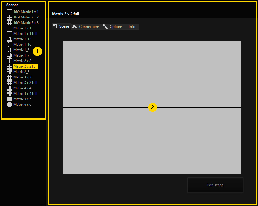 with a selection bar consisting of the tabs Scene, Connections, Options and Info, with which scenes can be edited.