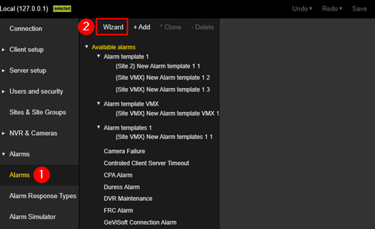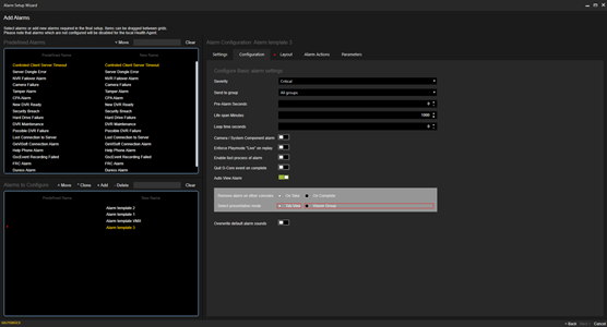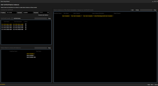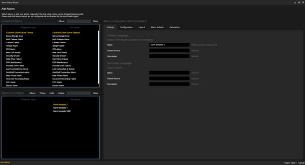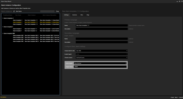 The Alarm Setup Wizard helps you to create and set up alarm templates as well as NVR and GeViSoft event-based alarm instances.