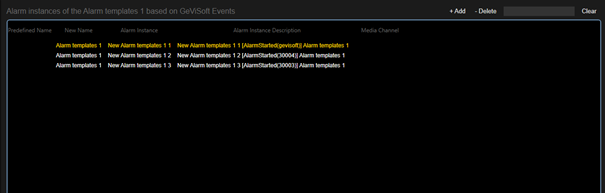 The Alarm instances of the Alarm template based on GeViSoft Events list contains the GeViSoft event-based or alarm-based alarm instances of the selected alarm template. Events or alarms that are used in the alarm instances of the selected alarm template are not displayed in this list.