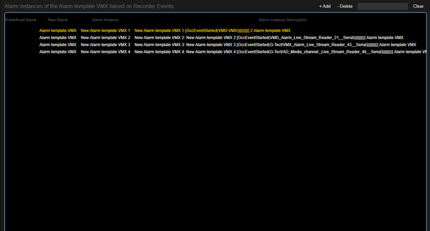 3. Add the selected events to the Alarm instances of the Alarm template based on Recorder Events list by clicking the + Add button or by drag and drop.