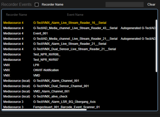 The Recorder Events list contains the events retrieved from the selected G-Core or GeViScope media sources (recorders).