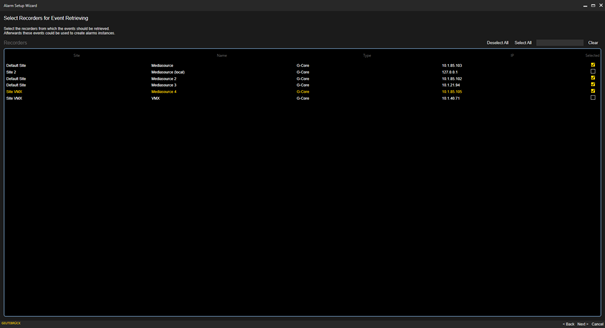 In the Select Recorders for Event Retrieving dialog window, select the G-Core or GeViScope media sources (recorders) from which to retrieve events.