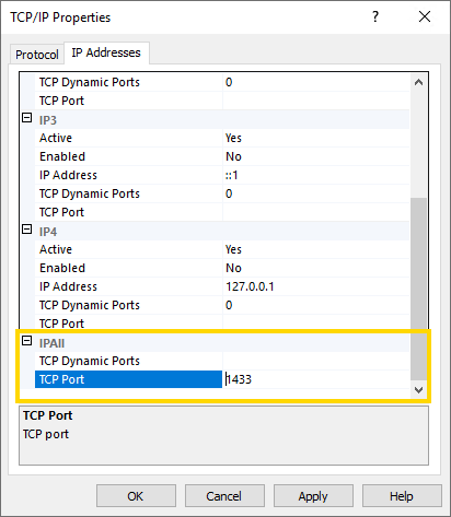The access port of the MSSQL database. The SQL instance uses a dynamic port by default. To use the event search function, you must change the port in the SQL Server Configuration Manager and set it to port 1433. |