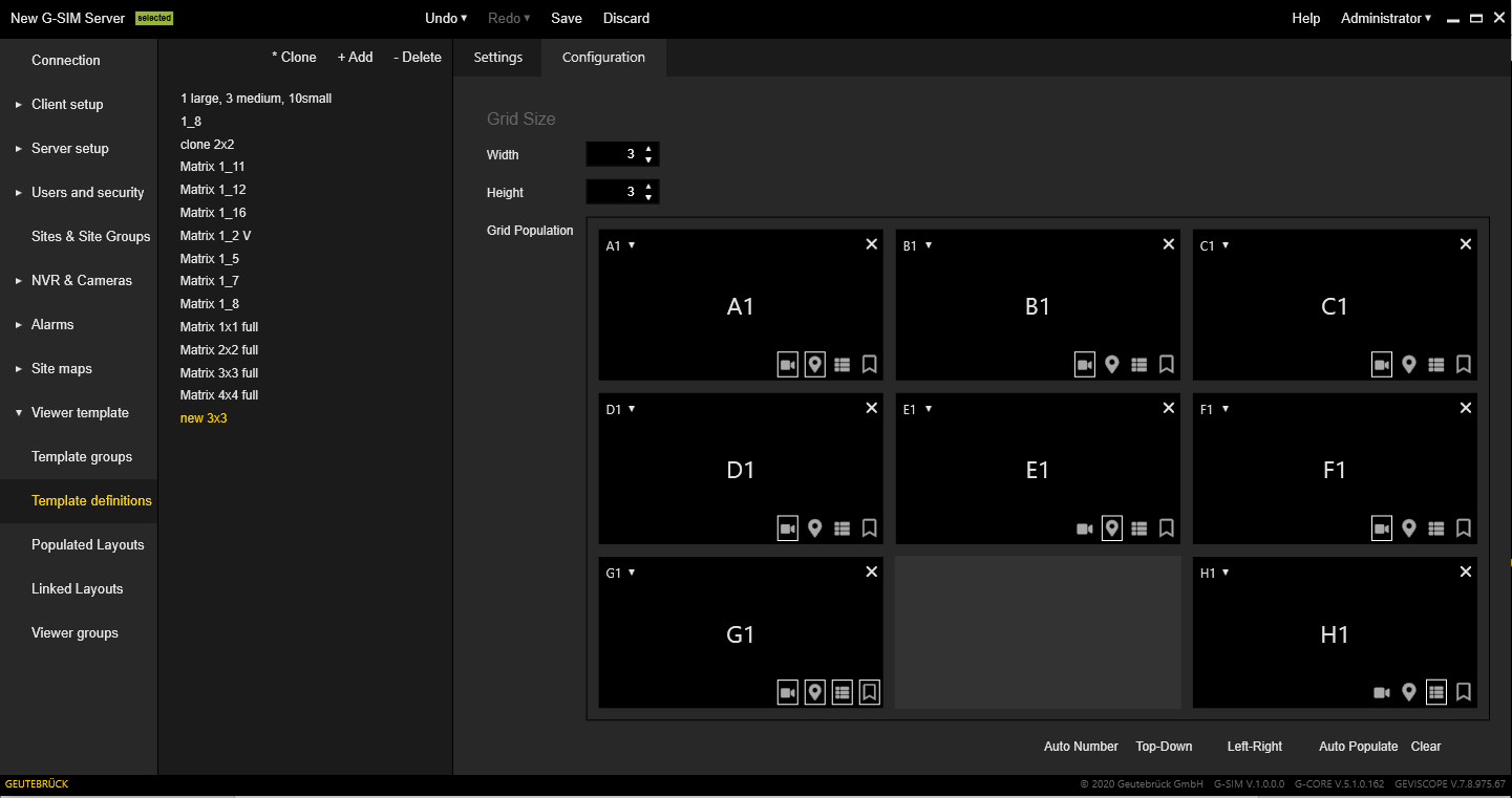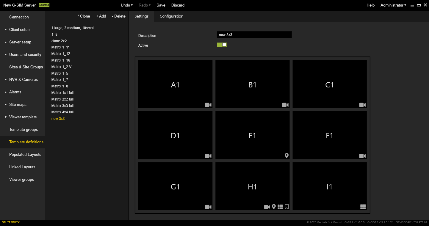 The Template definitions view allows the user to configure predefined layouts or create new layouts.