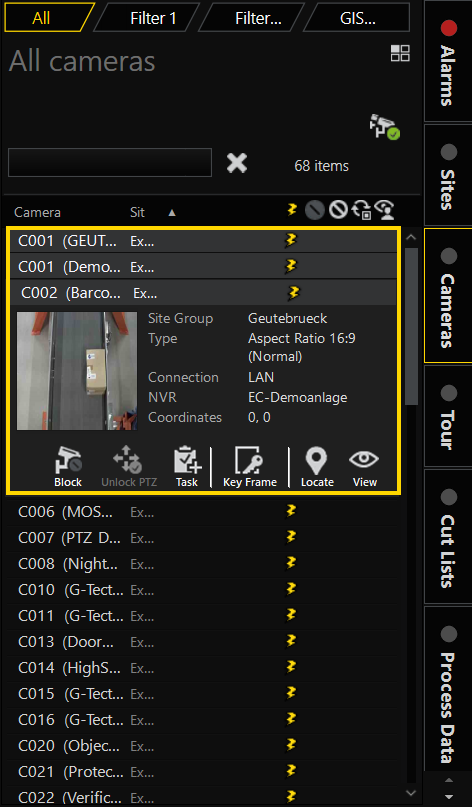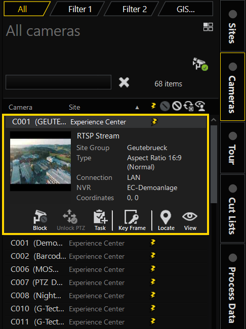 The text colors of list items indicate the fixed properties of the item, e.g. in the camera list the different camera groups are indicated by different colored text.
