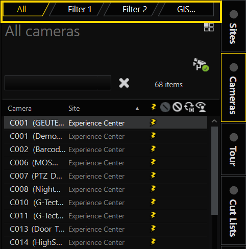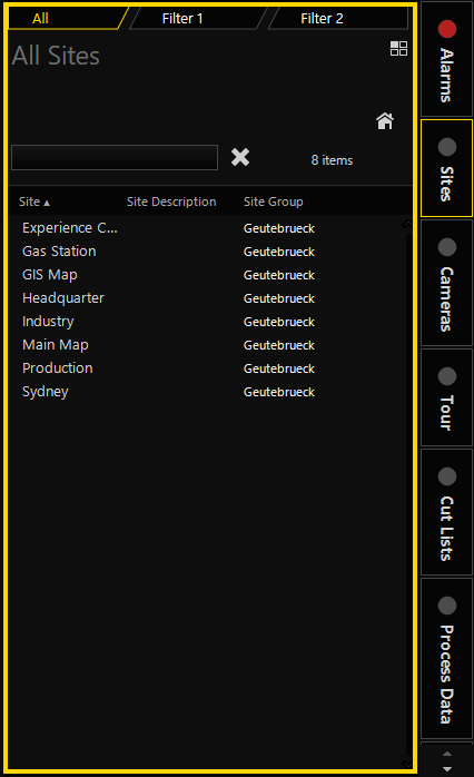 Under each menu tab you can find an individual tabbed lists area. At the top is a set of filter tabs that can be used to filter the tabbed list content. Depending on the tabbed list, the filter tabs vary. The first is usually All which is an unfiltered list, followed by two filter tabs, Filter 1 and Filter 2, that you can define (see Filtering).