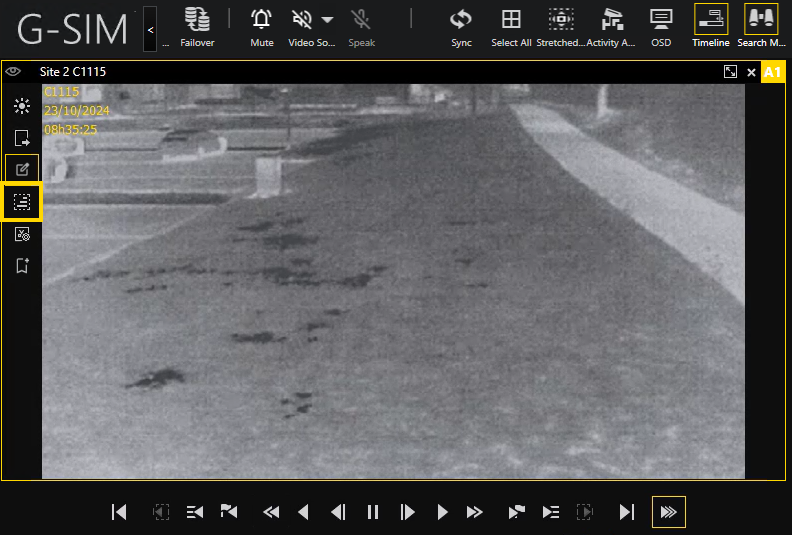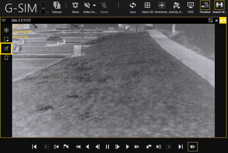 The Stretched View button turns on/off the Stretched View Mode. In stretched mode, the video frames of the camera fill all the viewer, and the viewer header is hidden. When stretched mode is off, the video frames of the camera are stretched accordingly to the camera type aspect ratio, and the viewer header is shown.
