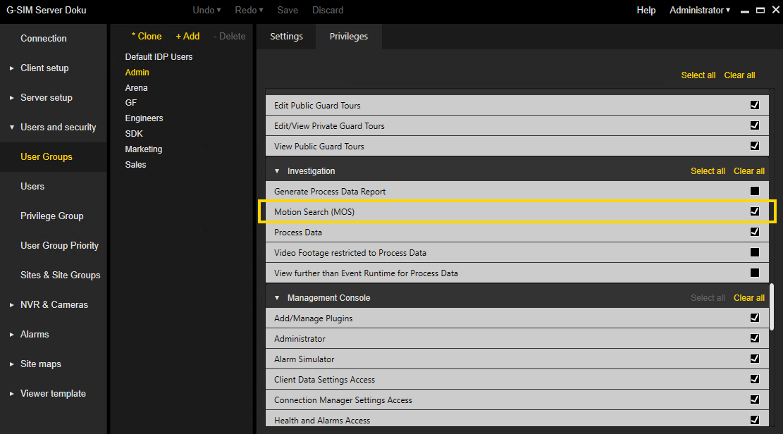 4. Under Investigation, enable the privilege Motion Search (MOS).