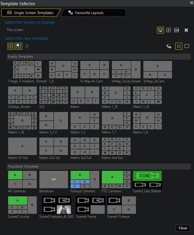 In the Select the new template area you can select another template for the selected screen. Generally, you can select between Empty Templates (see Template Definitions), Populated Layouts (see Populated Layouts) and Linked Layouts (see Linked Layouts) which are created in the ManCon. With the following icons you can display the different templates or layouts: