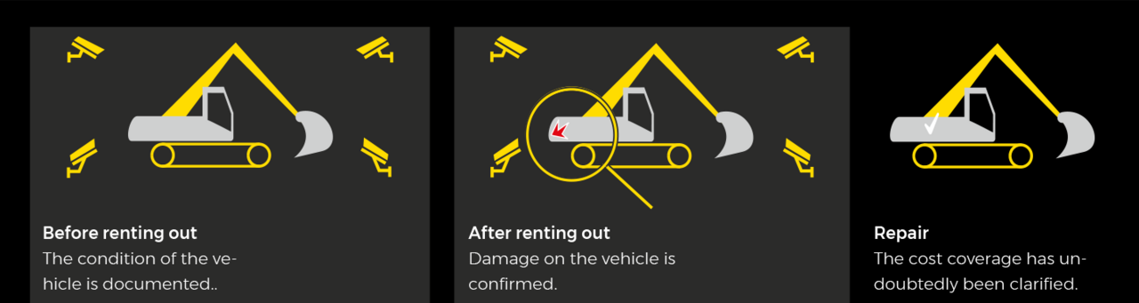 The machine condition is automatically documented and archived via video image BEFORE and AFTER the rental process. In order to be able to optimally record the rental machines, a test area is marked on the company premises. This area is equipped with highresolution cameras (4K) as well as LED headlights to enable a complete all around recording of the respective machine.